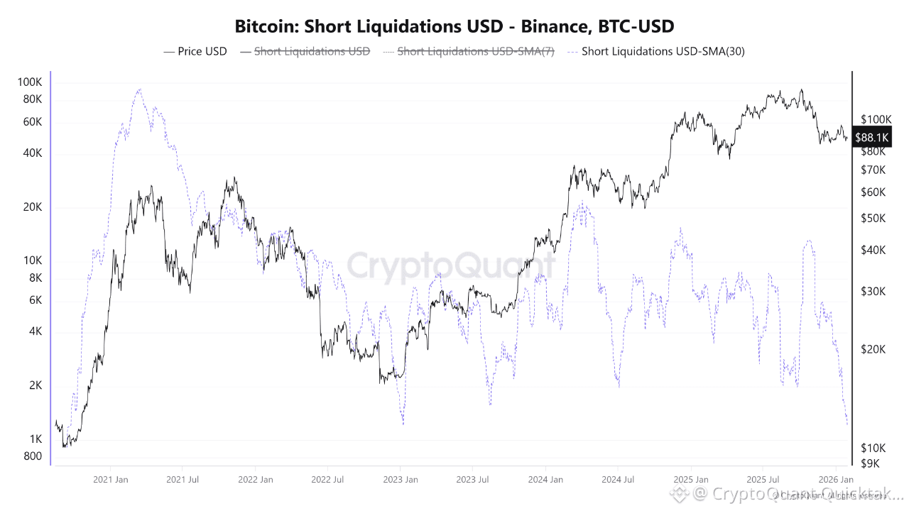 CryptoQuant data reveals that the 30-day Simple Moving Average (SMA-30) of Bitcoin short liquidations on Binance has plummeted to ~$1,200, a low not seen since September 2020.