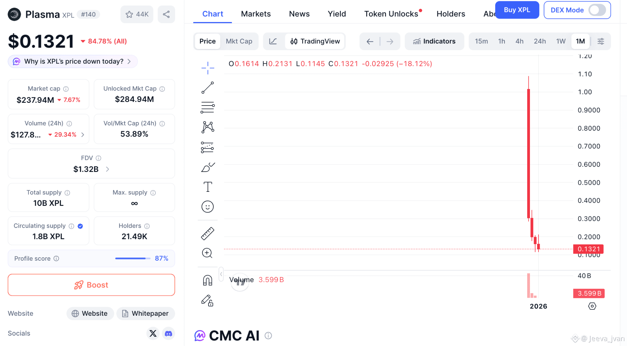 Plasma’s monthly chart is unmistakably the second kind. A towering wick into the highs, followed by a brutal retracement back toward the $0.13 region, signals a market that ran far ahead of consensus — and then collided with reality. Explosive upside, cascading sell pressure, and a volume spike measured in billions of tokens all point to a classic crypto inflection moment: early hype giving way to re-pricing as supply dynamics, unlock schedules, and speculative flows reset expectations.