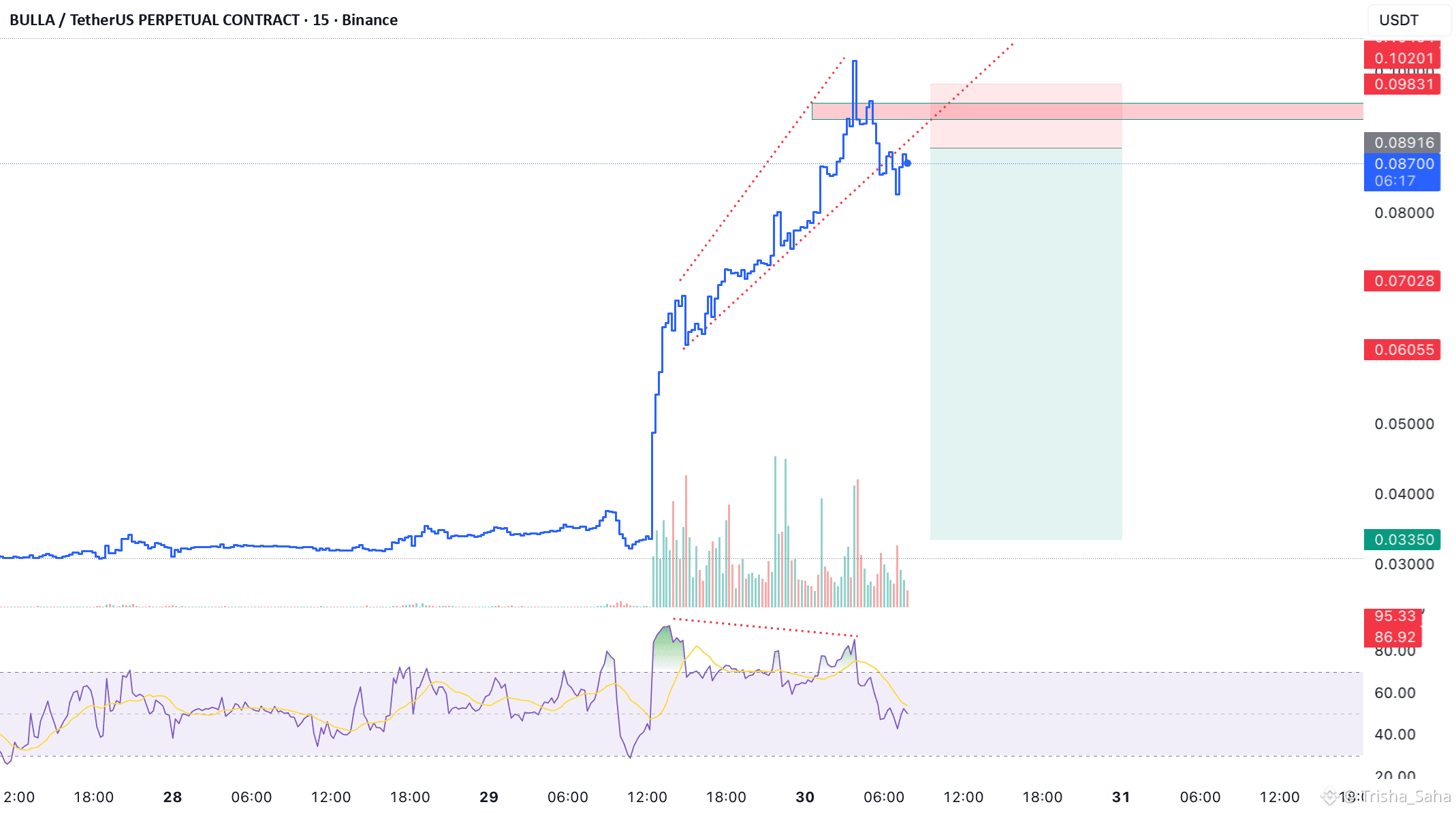 Across multiple timeframes, BULLA is showing extreme overbought conditions, signaling a high risk of mean reversion. On the 15-minute timeframe, a clear bearish divergence has formed, indicating weakening bullish momentum despite elevated prices.