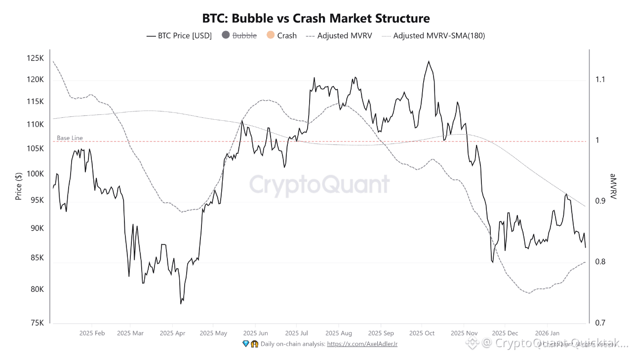 From a valuation perspective, the Bubble vs Crash Market Structure shows Bitcoin trading below its adjusted MVRV baseline, but not in deep undervaluation territory. Previous crash regimes required sustained MVRV breakdowns accompanied by aggressive downside acceleration, which is not yet evident.