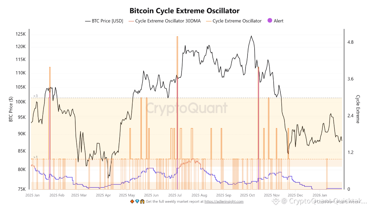 The Bitcoin Cycle Extreme Oscillator shows that recent drawdowns were not accompanied by persistent extreme spikes. Historically, cycle tops are marked by clustered and sustained extreme readings, reflecting synchronized speculative excess. In contrast, recent signals appeared briefly and faded quickly, pointing to localized profit-taking instead of broad cycle exhaustion. The declining 30-day average further supports gradual pressure release.