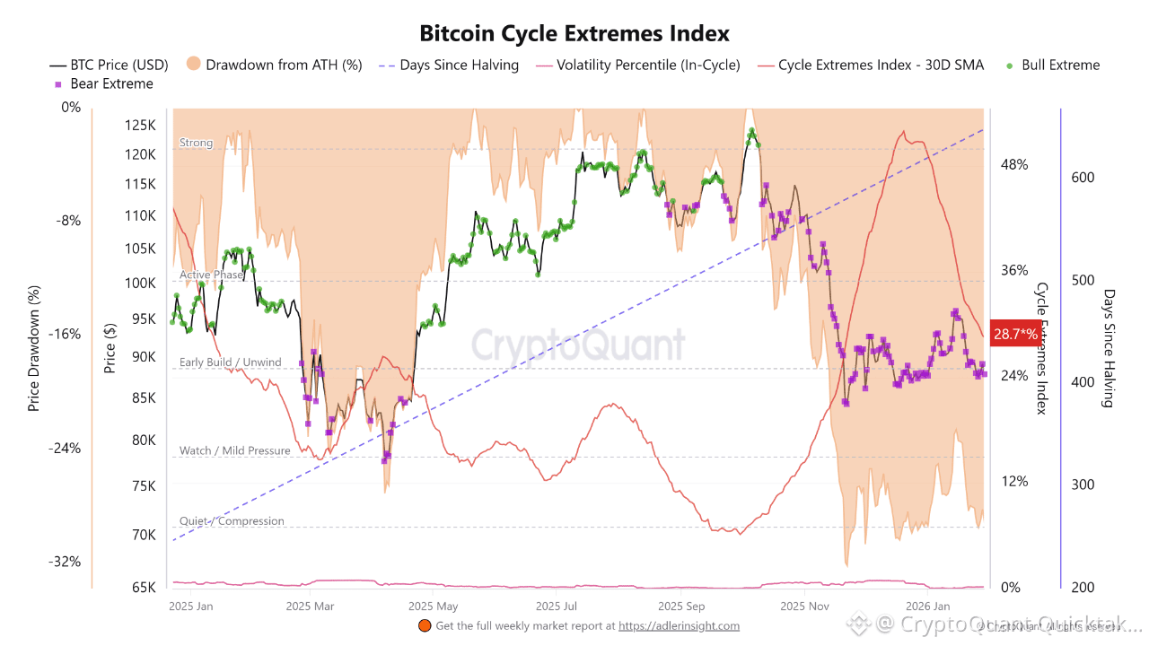 This view is reinforced by the Bitcoin Cycle Extremes Index, which currently sits near the mid-range (~28–30%), well below levels associated with euphoric bull extremes. Bull extreme signals have weakened since the Q3 peak, while bear extremes are present but remain scattered rather than concentrated. Volatility percentile has risen from compressed levels, suggesting redistribution rather than panic-driven deleveraging.