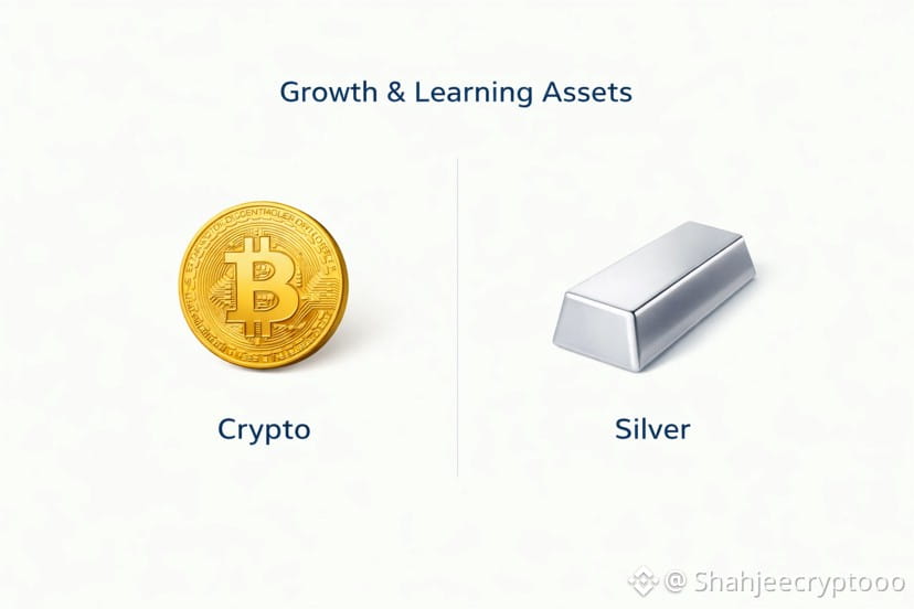 Silver adds another layer. It behaves differently from both crypto and stocks. It has industrial demand, reacts to economic cycles, and often follows gold with its own rhythm. Including silver helps you observe how commodities respond to inflation, growth expectations, and global uncertainty.