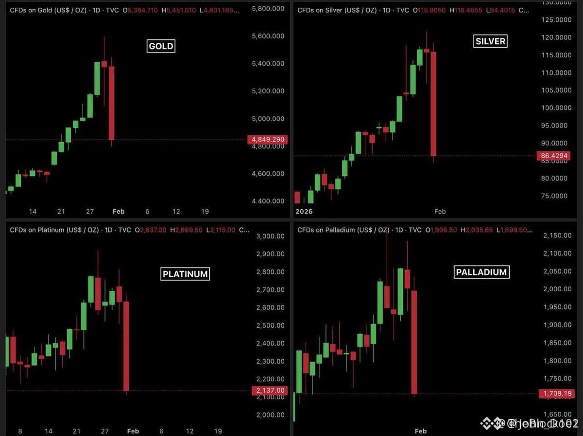 In just under 36 hours, the global precious metals market has experienced one of the most severe corrections in many years. Gold plummeted from around 5,600 USD to around 4,700 USD. Silver fell freely from 121 USD to nearly 77 USD. Platinum and palladium also did not escape a similar fate.