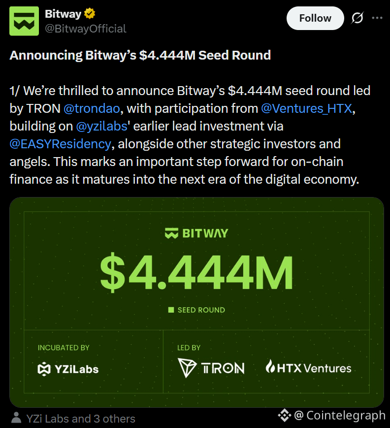 Onchain financial infrastructure provider Bitway raised more than $4.4 million in a seed funding round led by TRON DAO, with participation from HTX Ventures. The round builds on an earlier investment from YZi Labs through its EASYResidency initiative, alongside several strategic investors and angel backers.