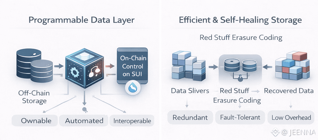 Walrus takes a fundamentally different approach. Data stored in Walrus becomes an on-chain object, managed through smart contracts on Sui, which acts as the protocol’s control plane. Ownership, metadata, access rules, economic terms, and cryptographic proofs all live on-chain, while the raw data itself remains off-chain within storage nodes.