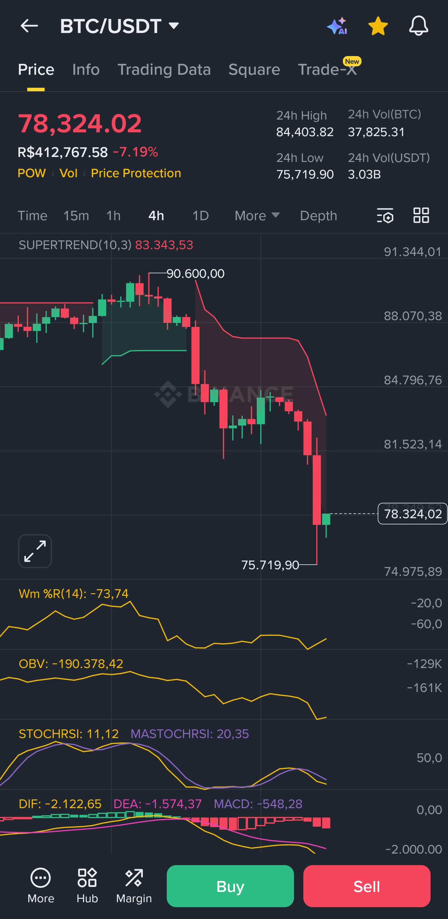 By observing the chart, we can trace the journey of a capitulation and an immediate reaction. The Supertrend indicator, crucial for identifying the dominant trend, firmly remained in "Sell" mode (red), with a clear resistance line at $84.076,31. This reinforces that, despite the recent relief, the short-term downtrend remains intact as long as the price stays below this level.