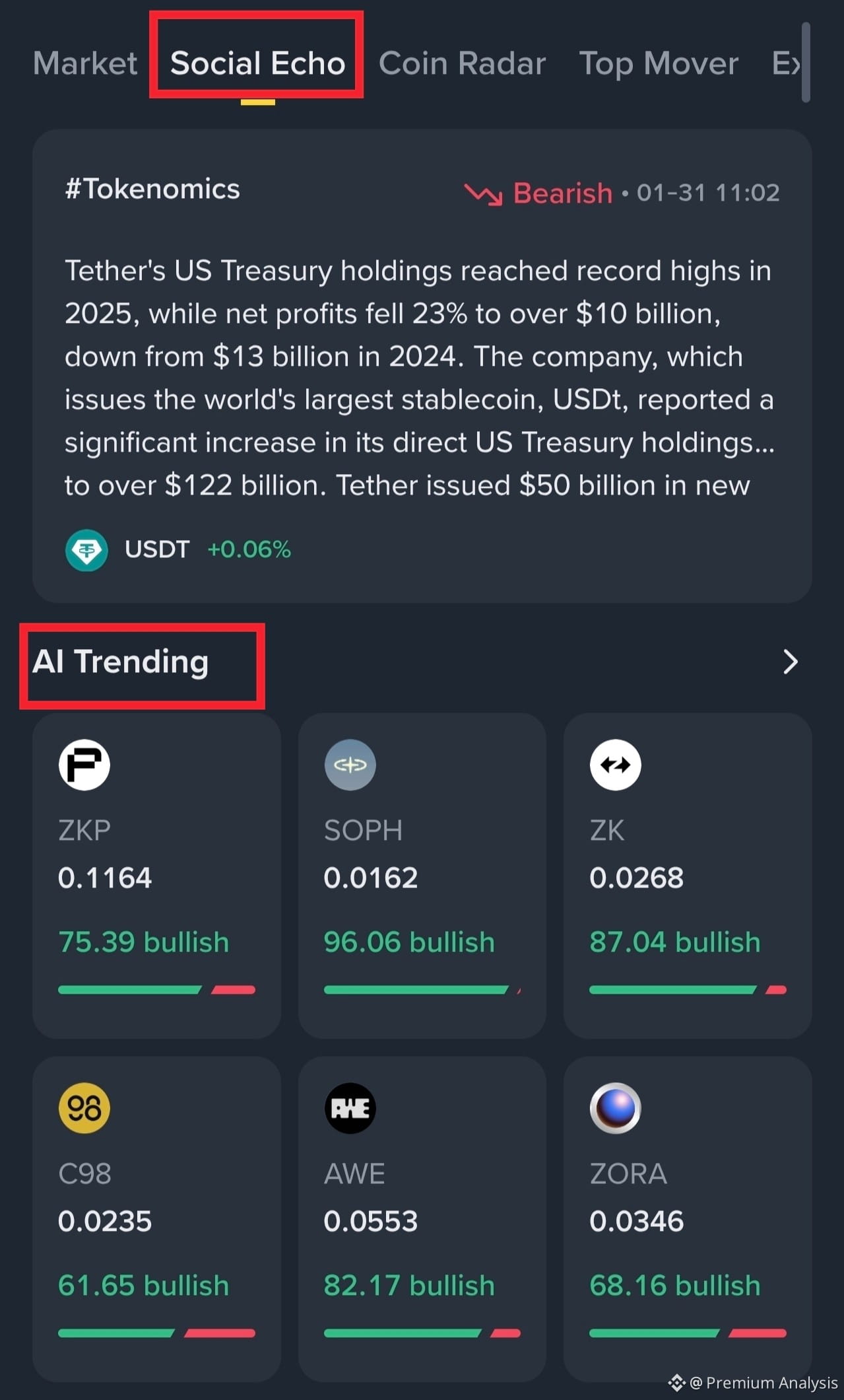 First, on the homepage, find the Trading Insight section. Then open the Social Echo tab → AI Trading. In that section, you'll see many coins being recommended right at the current moment for you to choose and write about.