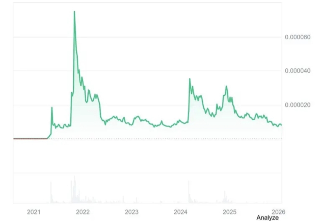 $SHIB (Shiba Inu), entered the top 10-20 at the end of 2021 → Despite memorable pumps, it remains far from its absolute ATH (loss >90-95 % from the peak in 2021, and stagnant or declining in relative bear phases post-2022).
