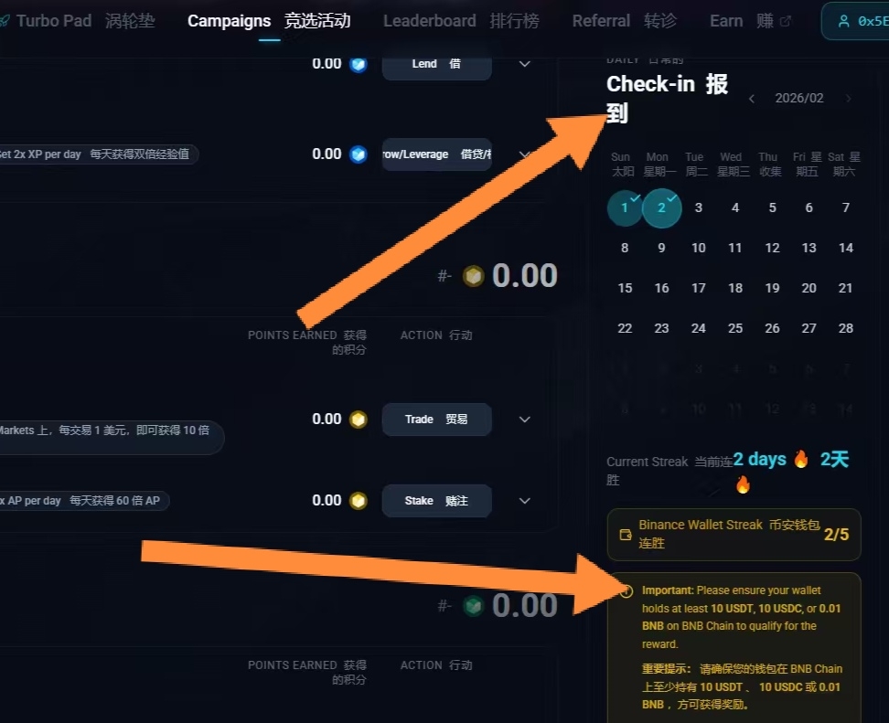 3. Check-in: Find the check-in area at the bottom of the page, switch the network to BNB Chain, and click check-in.