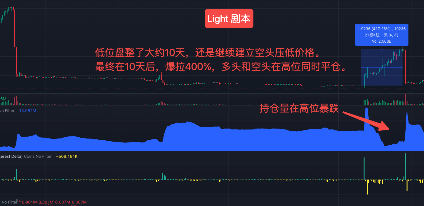 Light's Scenario: Without sufficient buying pressure, the market maker trades sideways at low levels, using time to create space, pulling the price up for a week or two, or even further driving it down. Then, with the continuous consumption of funding costs, they gradually absorb some of the opposing positions at the low level. Finally, they make a sudden surge, simultaneously closing out their long and short positions at the high level.