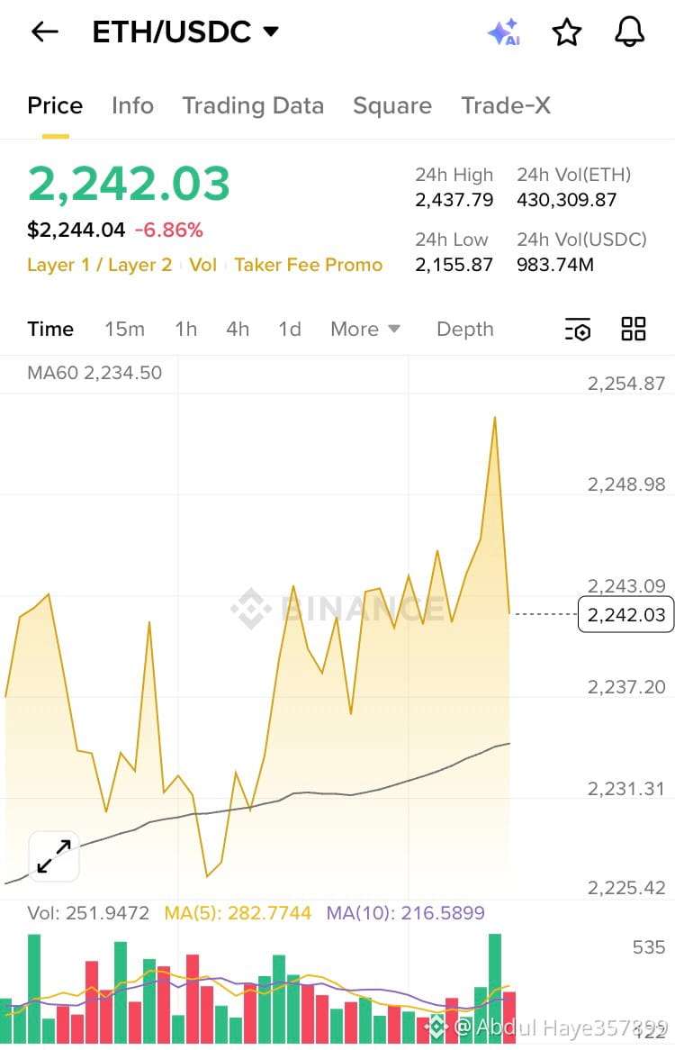 $ETH ETH’s recent drop of roughly 6–7% is not a random move, nor is it evidence of some hidden collapse; it is a textbook short-term market reaction driven by technical rejection, momentum loss, and broader risk sentiment. ETH attempted to push above the 2,430–2,450 resistance zone but failed to hold that level, which immediately triggered profit-taking from short-term traders. This rejection is visible on lower timeframes where price printed a sharp upside move without sustained follow-through, a classic sign that buyers were running out of strength. When price cannot consolidate above resistance, it signals that demand is insufficient to absorb sell pressure, and the market naturally moves lower to search for liquidity. Volume behavior confirms this: selling volume expanded on the downside while buying volume weakened after the push up, indicating distribution rather than accumulation. This is not how strong breakouts behave. In addition, $ETH is currently not leading the market; it remains highly correlated with Bitcoin and typically underperforms BTC during periods of uncertainty. When Bitcoin stalls or pulls back, $ETH tends to fall harder due to its higher risk profile, greater leverage exposure, and stronger retail participation.