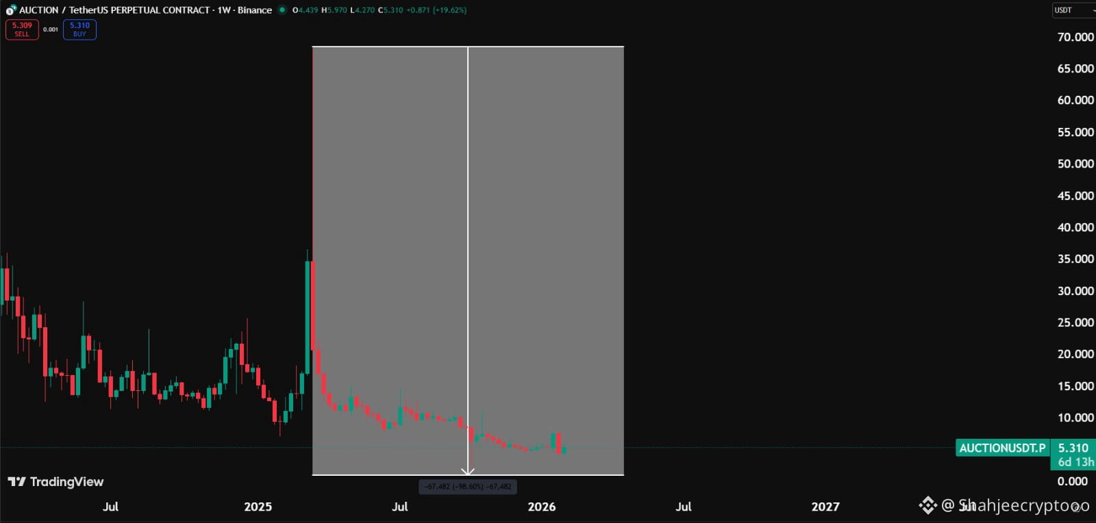 $AUCTION is a clear example that not every big dip is a buying chance. This coin peaked and then kept falling for almost two years. From the top to the recent lows AUCTION is down around 95 to 97 percent. The important detail is not the drop itself but the failure to recover. Even after multiple market phases price never reclaimed major weekly levels. Many traders kept averaging because the project looked legit and liquidity was still visible. But the chart kept bleeding. This is how slow rug pulls work. No sudden collapse just steady distribution while people stay hopeful. Time quietly destroys the position.