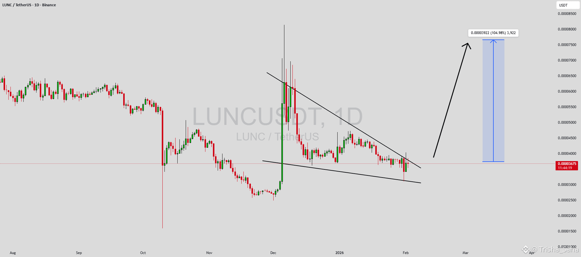 LUNCUSDT is forming a clear bullish pennant pattern, a classic bullish reversal signal that often indicates an upcoming breakout. The price has been consolidating within a narrowing range, suggesting that selling pressure is weakening while buyers are beginning to regain control. With consistent volume confirming accumulation at lower levels, the setup hints at a potential bullish breakout soon. The projected move could lead to an impressive gain of around 90% to 100% once the price breaks above the pennant resistance.