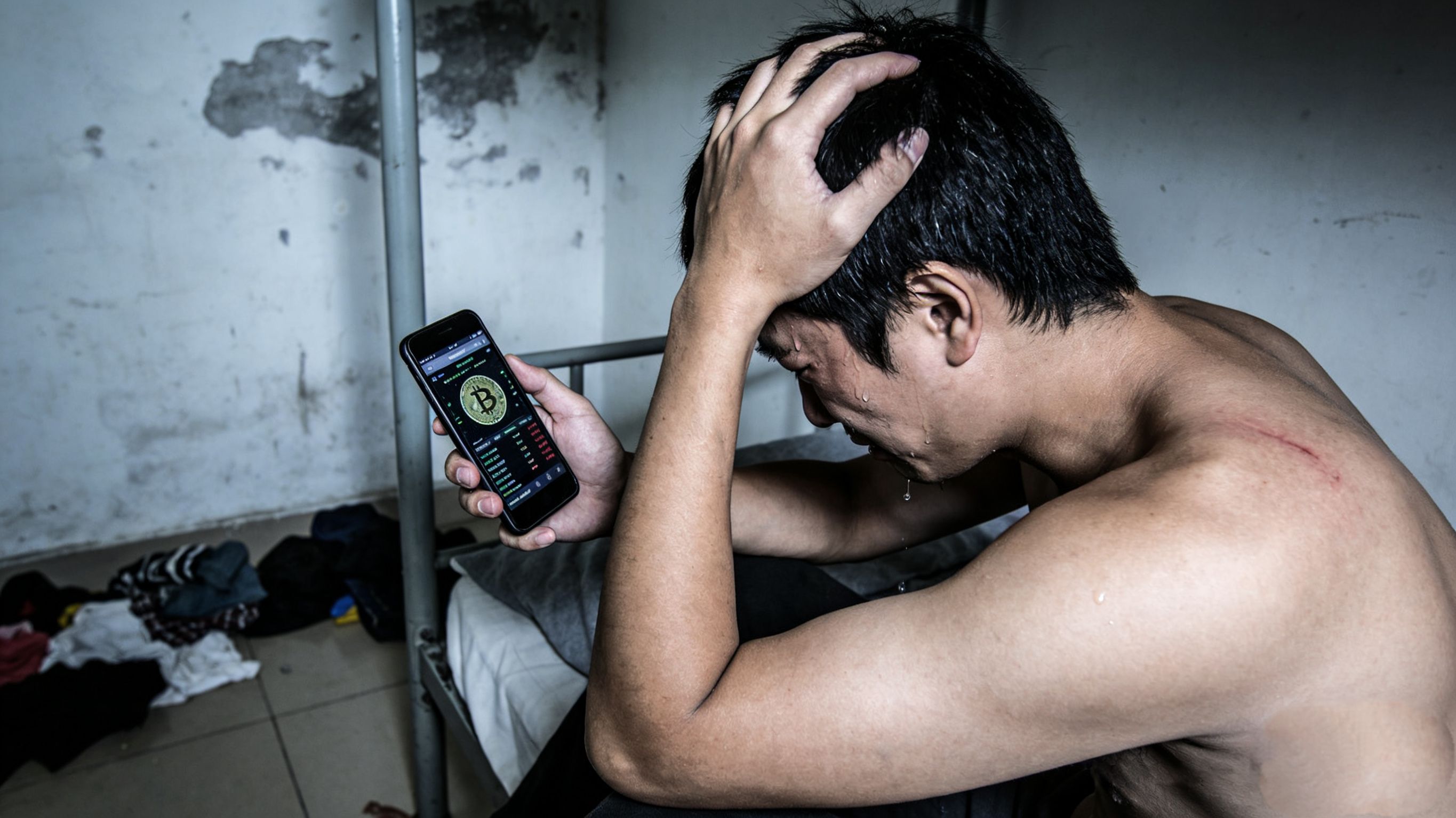 A smartphone, an internet connection, and a virtual currency trading platform are filled with motivational phrases like 'earn hundreds of U while lying down for a day' and 'easily achieve class transition', which constantly erode the values of workers.