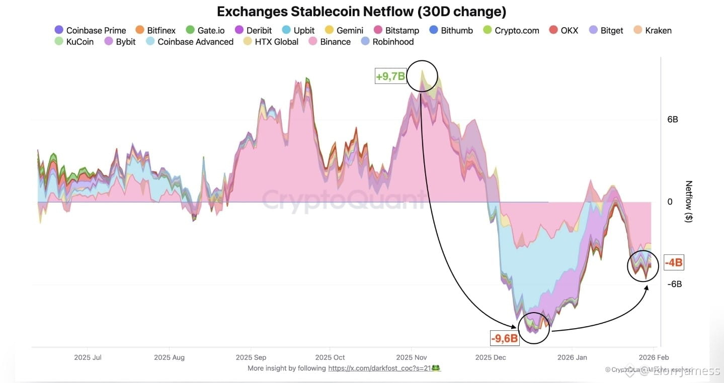 Darkfost said the stablecoin market grew by over 140 billion dollars since 2023 but noted that total stablecoin supply started to fall in December ending that long growth phase He said the clearer signal comes from exchange flows strong inflows usually show investors want exposure while outflows point to capital protection and lower risk taking.