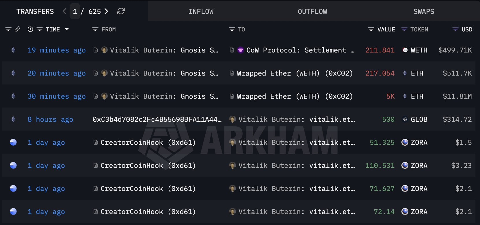 Main transaction: Wallet vitalik.eth sold 493 ETH in 8 hours (~$1.16M), and 211.84 ETH exchanged for $500K USDC – then transferred directly to Kanro, the charity fund established by Vitalik in 2023 (focused on longevity research, biosecurity, disease prevention like COVID).