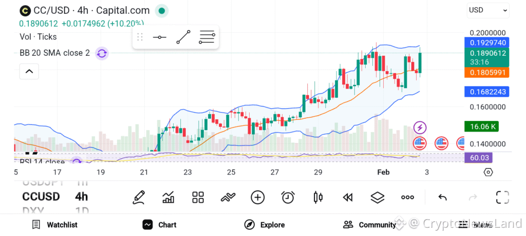 Canton continues to rank among the strongest performers across the broader crypto market. Price action reflects a clean and sustained uptrend supported by consistent demand. Over the past two weeks, CC maintained upward momentum, gaining nearly 30 percent during the last seven days alone. This steady advance positions the token as a relative outperformer during volatile conditions.