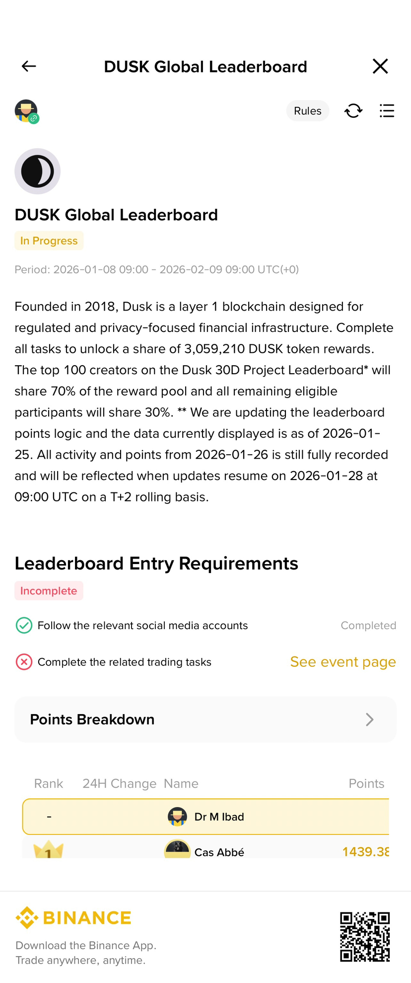 Complete all tasks to unlock a share of 3,059,210 DUSK token rewards. The top 100 creators on the Dusk 30D Project Leaderboard* will share 70% of the reward pool and all remaining eligible participants will share 30%. To qualify for the Dusk Project Leaderboard, you must complete Task 1, 3 or 4 plus Task 6. To qualify for the reward pool, you must complete the additional X follow and post task (Task 2 and 5). The reward pool will be split into 2 with 1,529,605 DUSK for Chinese Creators and 1,529,605 DUSK for all other language Creators. Posts involving Red Packets or giveaways will be deemed ineligible. Participants found engaging in suspicious views, interactions, or suspected use of automated bots will be disqualified from the activity. Any modification of previously published posts with high engagement to repurpose them as project submissions will result in disqualification. * We are updating the leaderboard points logic and the data currently displayed is as of 2026-01-25. All activity and points from 2026-01-26 are still fully recorded and will be reflected when updates resume on 2026-01-28 at 09:00 UTC on a T+2 rolling basi