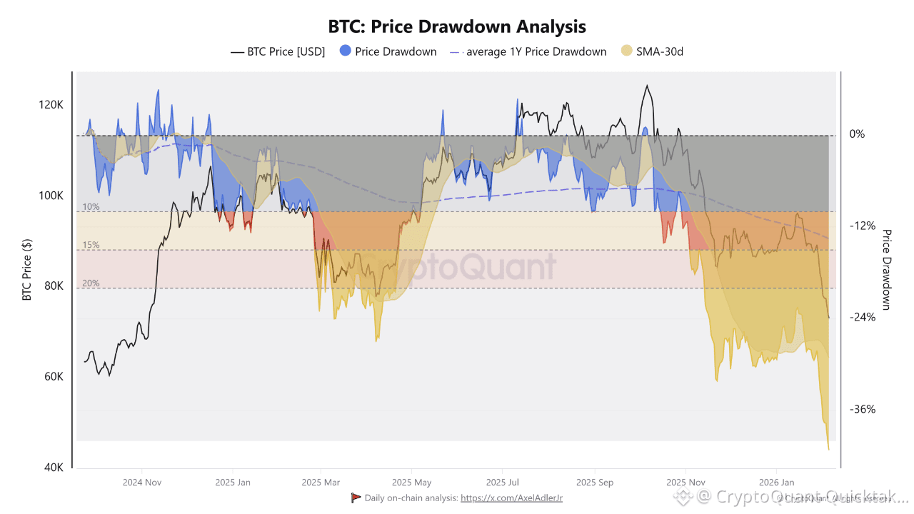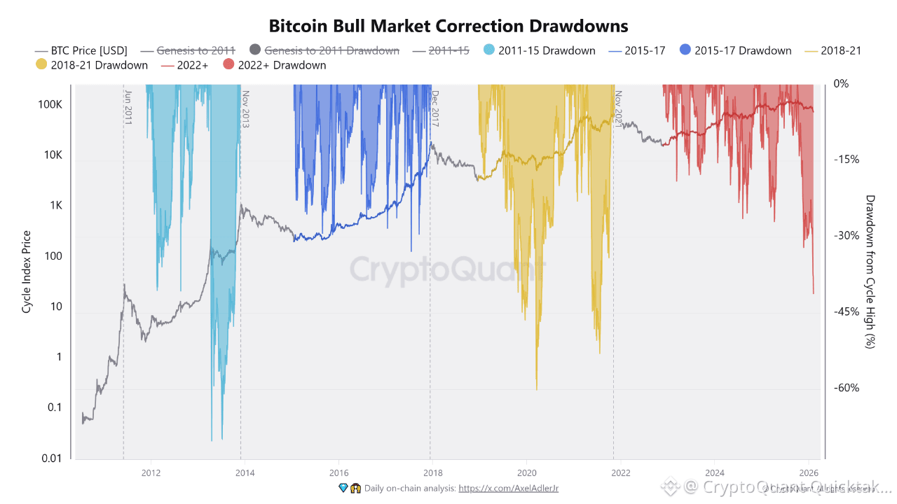 Current on chain drawdown data shows Bitcoin has declined roughly 36% from its recent cycle high, marking one of the sharpest pullbacks of this bull phase. In isolation this magnitude appears severe, but historical cycle comparison suggests the correction remains structurally consistent with prior bull market behavior rather than signaling a confirmed macro top.