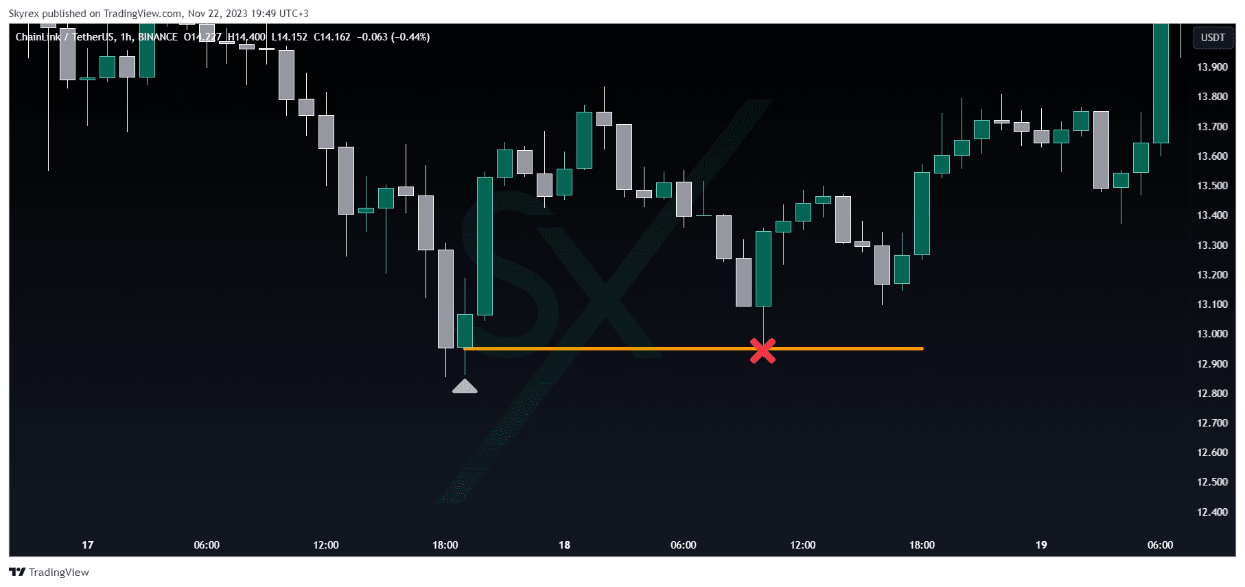 A critical consideration in this context is that if the bar defining the pivot low (termed as the Base Reference Bar) exhibits a lower value than either of the two placements, then the placement will default to utilizing the low of the Base Reference Bar.