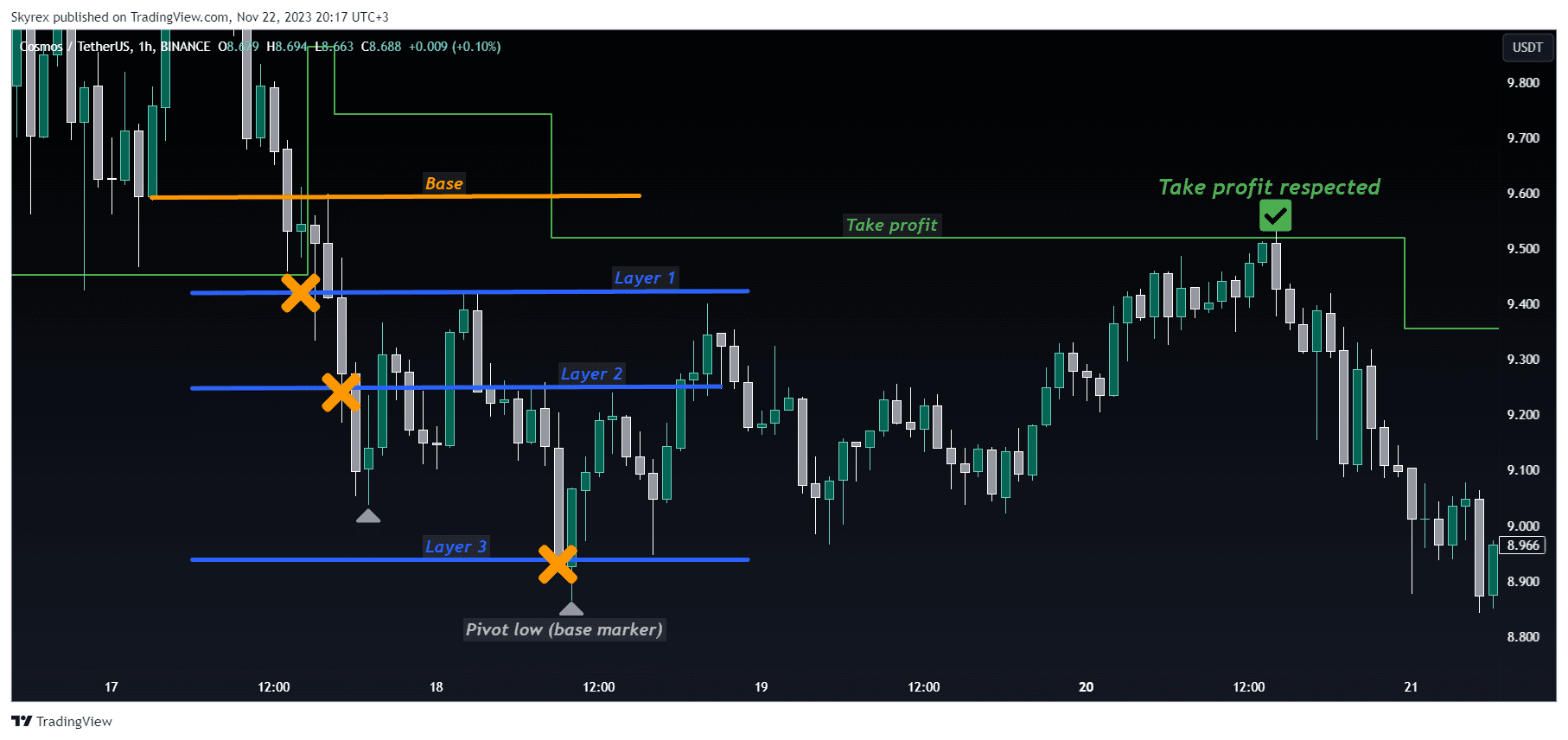 As illustrated, the initial base along with layers 1 and 2 are breached. However, when the price subsequently ascends, the entire configuration is deemed adhered to upon the base being respected. Consequently, in this scenario, a total of four alerts are activated: