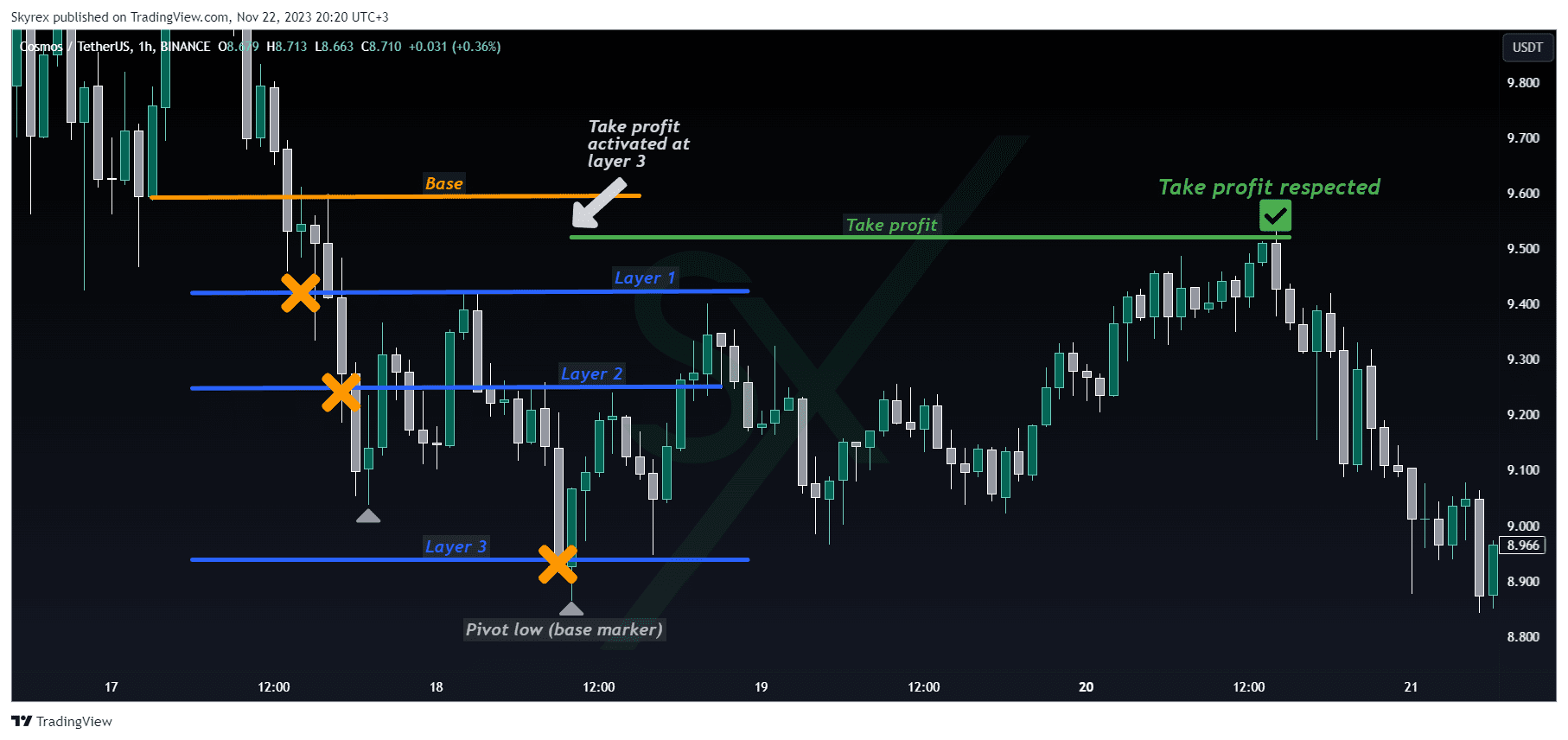 The system is designed to incorporate a "Take Profit" feature, which enables to exit a trade following a base crack, thereby mitigating the risk of the base not being respected. Alongside the Take Profit functionality, the system also allows for the configuration of Break Even and Stop Loss parameters. These can be activated at predetermined layers, offering users the flexibility to tailor the timing of their application.