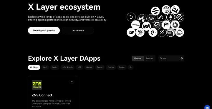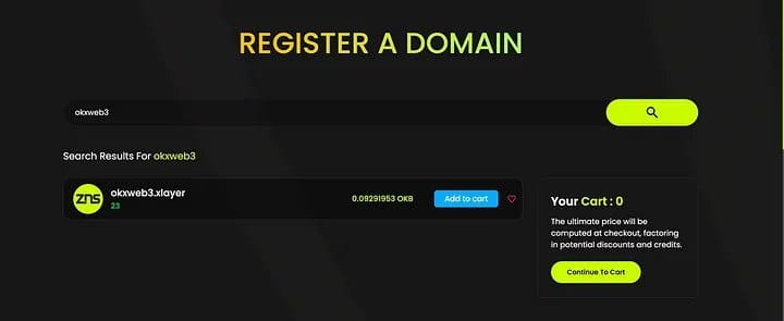 Navigate to znsconnect : https://v3.znsconnect.io/?ref=clvb7r99o0003aqdcm0i13o8u to explore the integration of X Layer Chain and choose your domain.