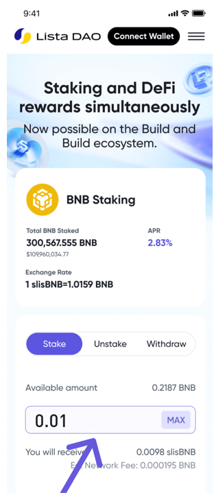 Input the amount of BNB you would like to liquid stake on Lista. Remember to leave some BNB behind for gas!