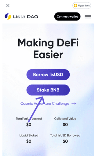 Once your wallet has been funded with BNB, the next step is to liquid stake your BNB into slisBNB on Lista DAO.