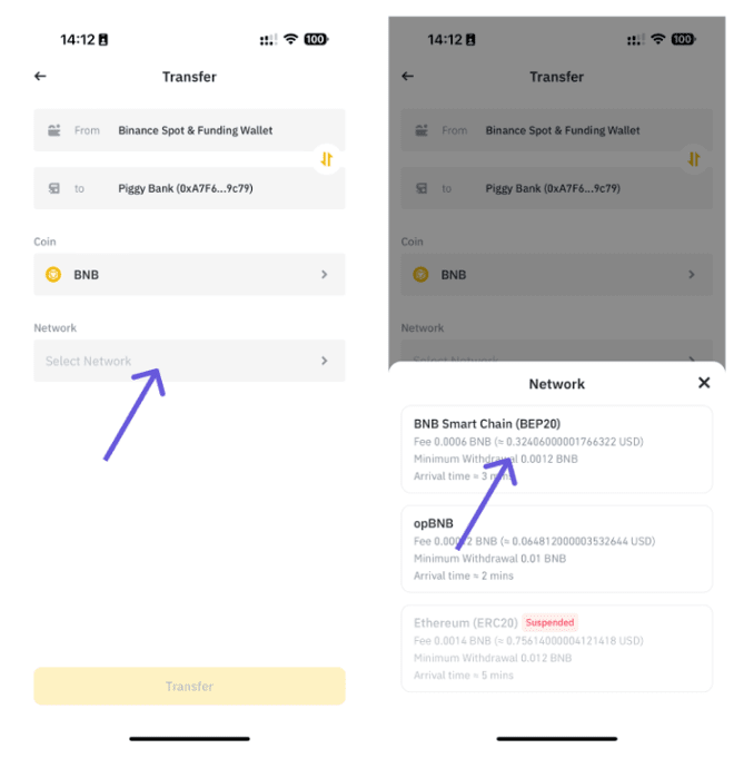 - Select the Coin to transfer, which will be BNB in this case, and choose the BNB smart chain (BEP-20) network to transfer your funds through.