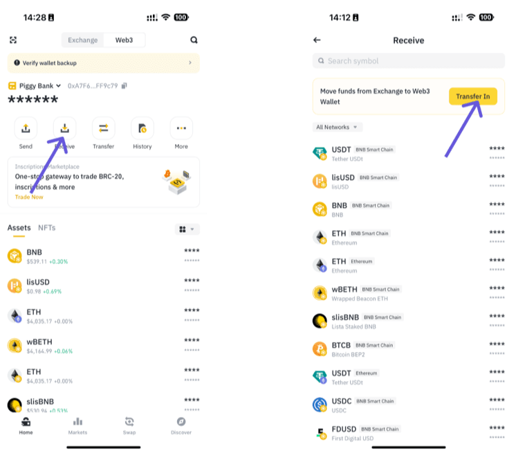 To fund your wallet, click on “receive”. If you are transferring funds from your binance account, click on “transfer in”.