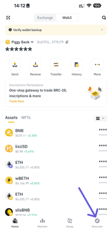 Log in to your Binance app and click on the “Wallets” section. Go to “Web3”.