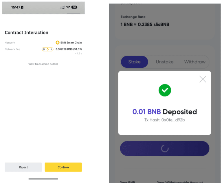 Confirm the transaction, and a notification will appear once your BNB has been liquid staked on Lista DAO.