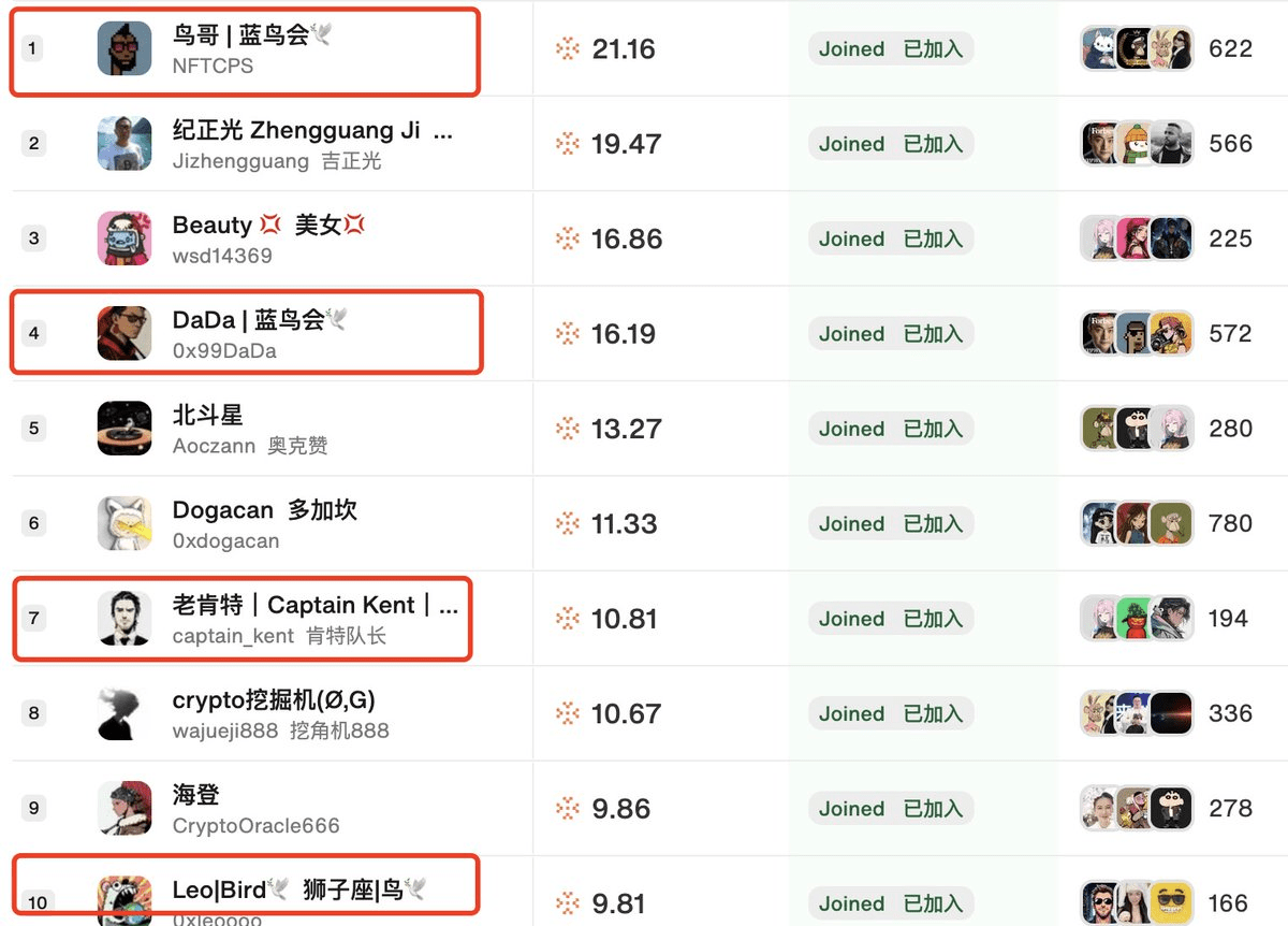 En la cima está el hermano pájaro @NFTCPS, seguido por un grupo de 'pájaros pequeños' @0x99DaDa, @captain_kent, @0xleoooo