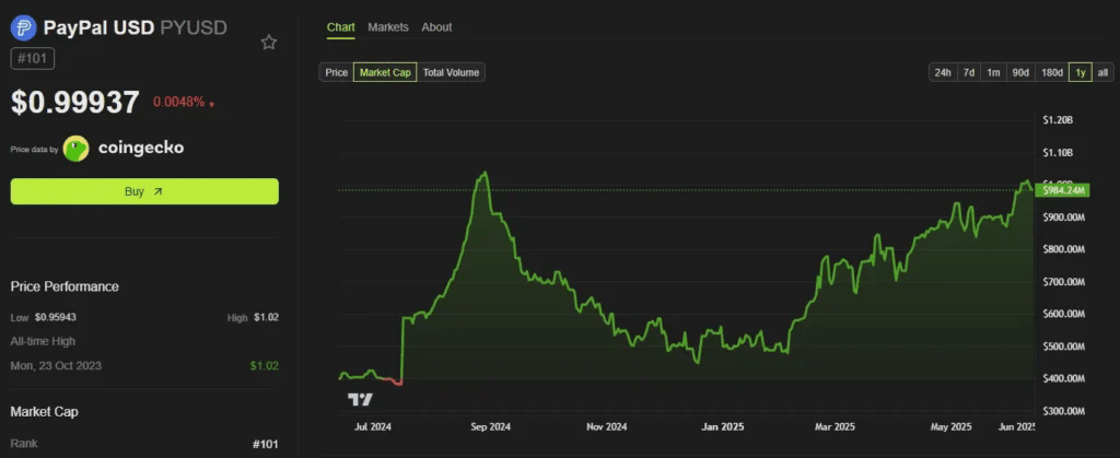 Información de BeInCrypto indica que en junio de 2025, la capitalización de mercado de PYUSD alcanzó los 984 millones de USD, aumentando desde los 490 millones de USD a principios de año. Esto sugiere que PYUSD tiene el potencial de superar pronto los 1 mil millones de USD a finales de 2025, y podría establecer un nuevo récord en su desarrollo.