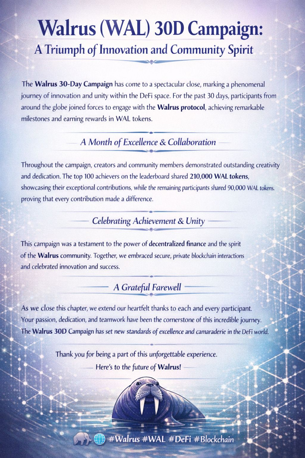 La Campaña Walrus de 30 Días ha concluido oficialmente, dejando un legado de innovación, participación y celebración comunitaria. Durante el último mes, creadores y participantes de todo el mundo se unieron para explorar las capacidades seguras y privadas del protocolo Walrus, ganando recompensas WAL y fortaleciendo el ecosistema DeFi.