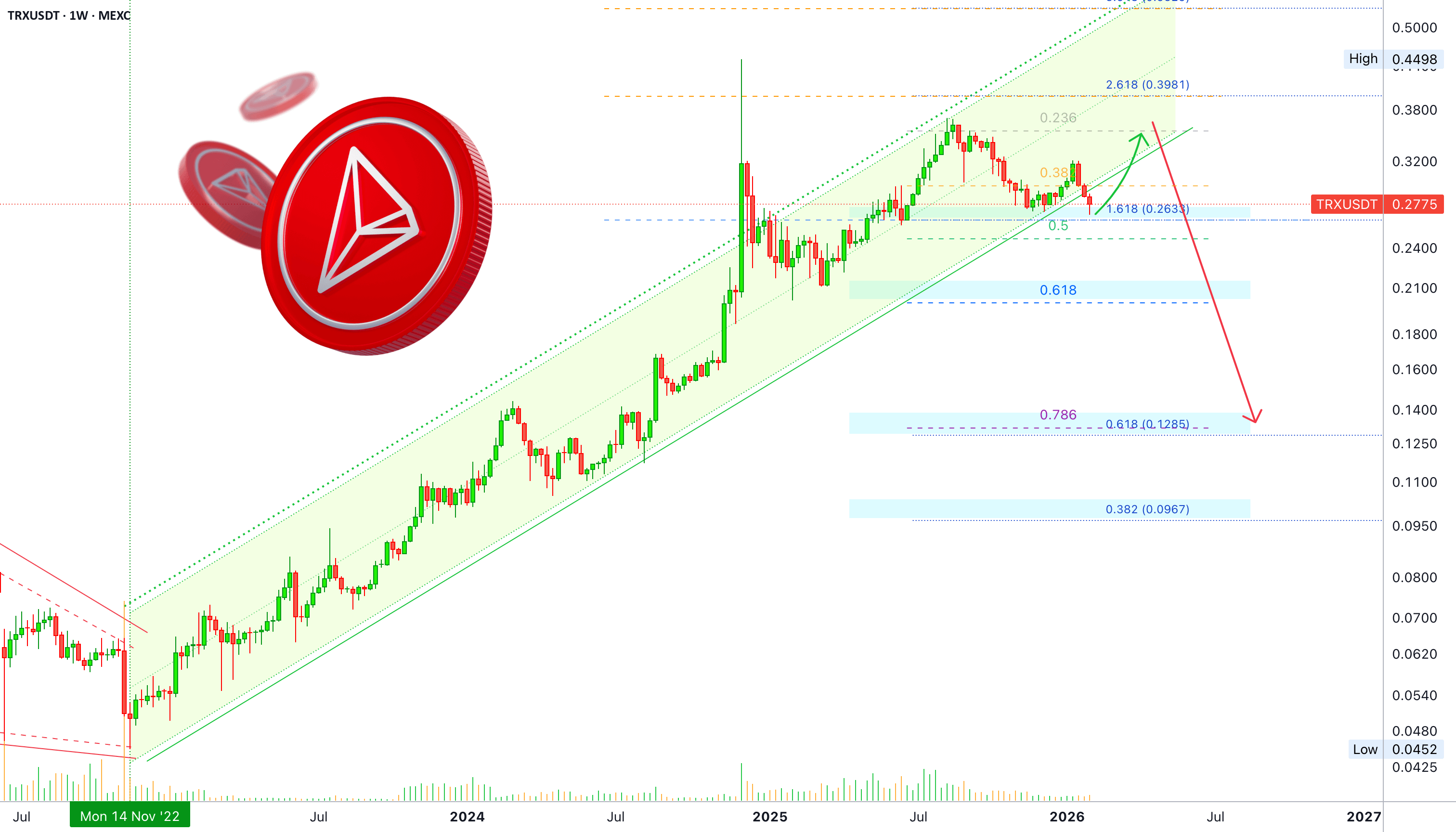 Dado que TRON fue muy fuerte en los últimos tres años, puede suceder que el mercado bajista para este proyecto se vuelva completamente brutal. Toda la acción bajista que falta en este gráfico puede surgir en la segunda mitad de 2026.