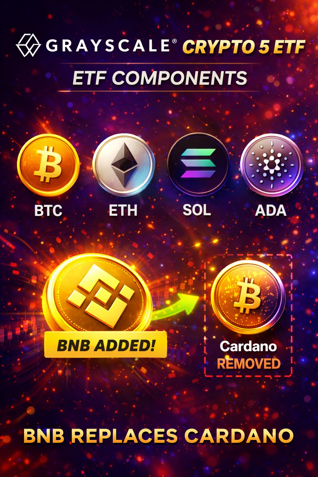 Binance Coin ($BNB ) está de vuelta en el centro de atención después de un importante desarrollo institucional. Grayscale ha añadido oficialmente BNB a su ETF Crypto 5, reemplazando otro activo de gran capitalización. Este movimiento ha despertado un renovado interés entre los traders y los inversores a largo plazo, ya que la exposición institucional a menudo redefine las tendencias del mercado.