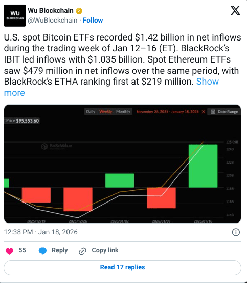 Entre el 12 de enero y el 16 de enero, los ETFs de Bitcoin en EE. UU. registraron entradas de $1.42 mil millones y $1.035 mil millones, respectivamente, con el IBIT de BlackRock liderando la carga.