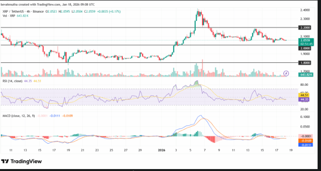 Además, las barras del histograma planas confirman la ausencia de una tendencia direccional fuerte. En el lado negativo, el soporte inmediato se encuentra cerca de $2.00, un nivel que ha sido probado múltiples veces en sesiones recientes, convirtiéndolo en un área crítica a seguir para el próximo movimiento de XRP.