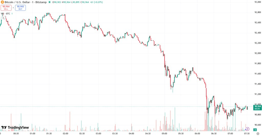 #bitcoin (BTC): −1.6% → $91,020