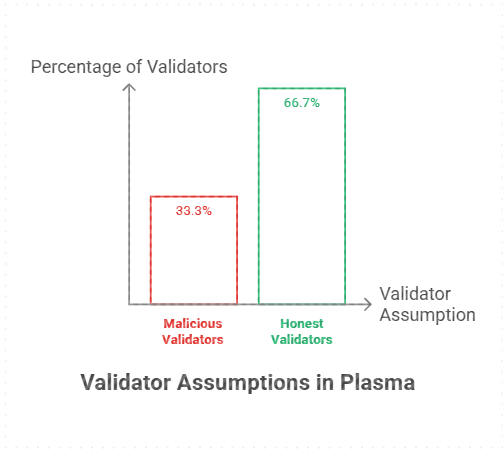 Plasma utiliza suposiciones BFT estándar. Menos de un tercio de validadores maliciosos y el sistema se mantiene. La misma lógica de resistencia de mayoría en la que Bitcoin confía económicamente.