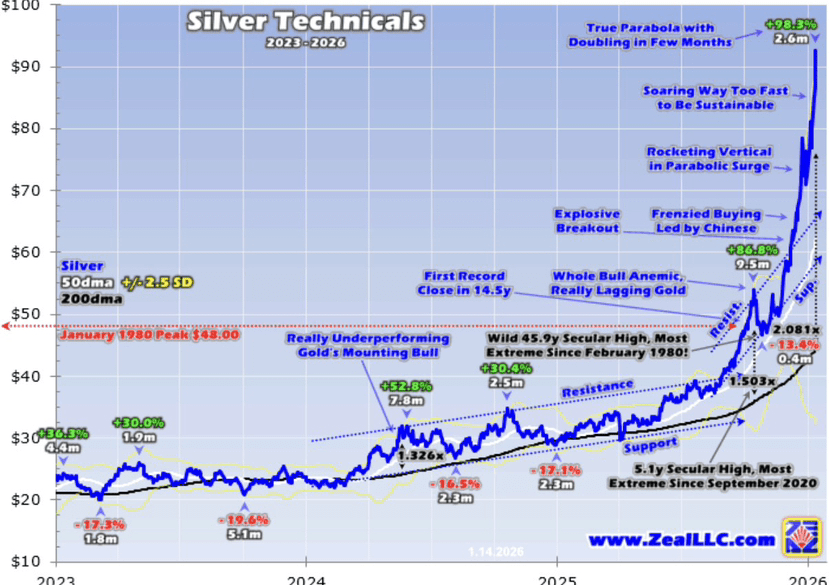 Precio de la plata: rupturas relevantes + aceleración clara → estructura parabólica, típica de activo monetario reaccionando a: