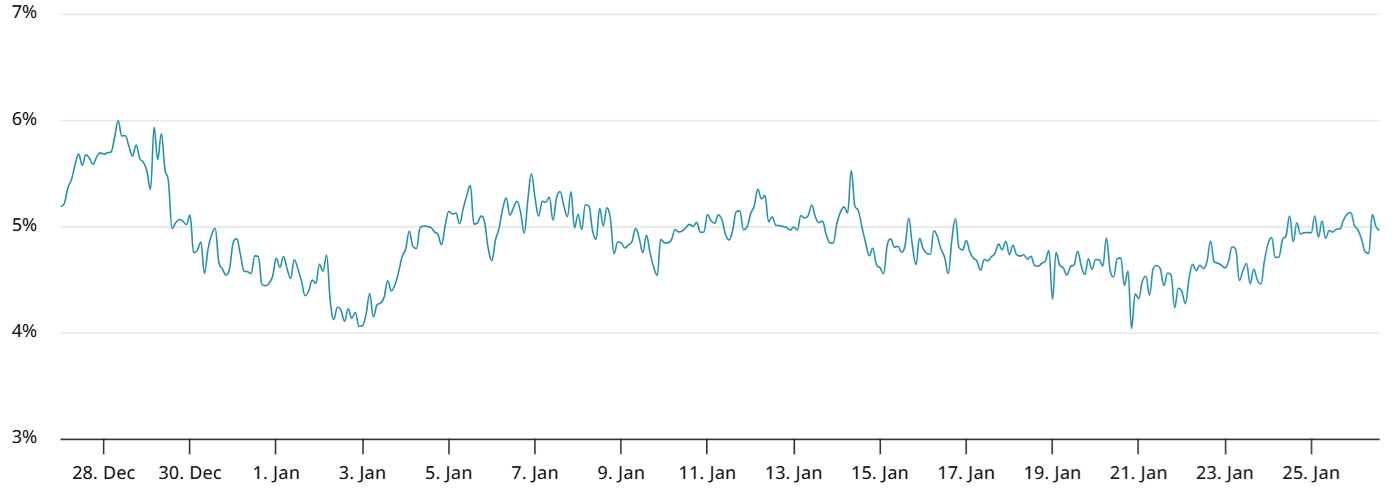 Curiosamente, incluso con los rendimientos de los bonos del Tesoro de EE. UU. a 5 años superando a los de Europa y Japón en 3.8%, los inversores aún se preparan para una mayor inflación en EE. UU. Se está volviendo cada vez más evidente que EE. UU. adoptará una política monetaria más suave, particularmente a medida que termine el mandato del presidente de la Fed, Jerome Powell, en abril.