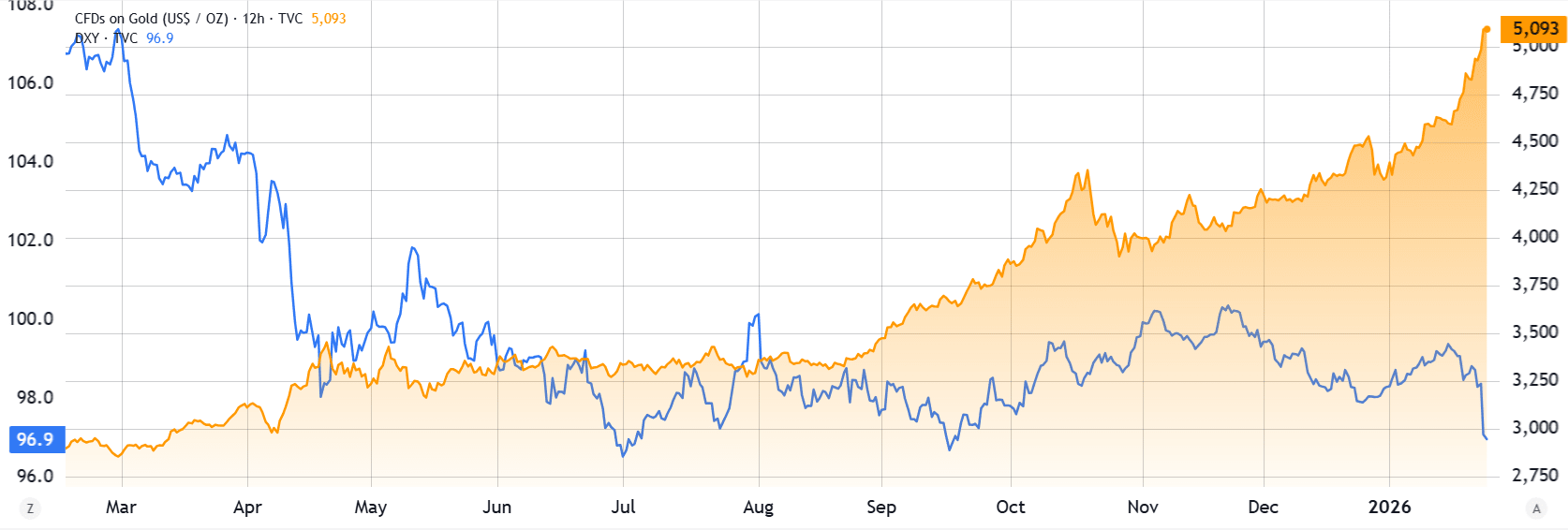 Índice de Fuerza del Dólar Estadounidense (izquierda) vs. oro/USD (derecha). Fuente: TradingView