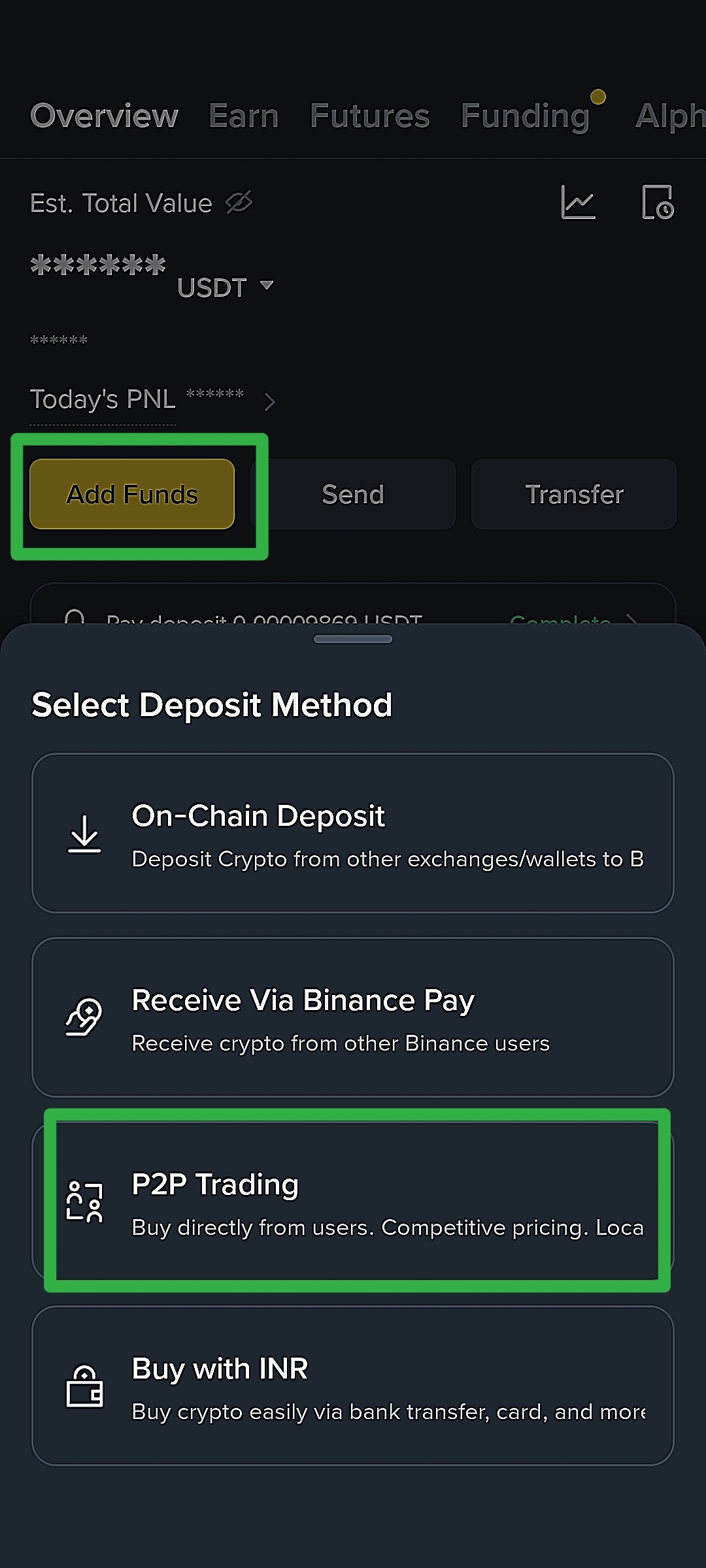 Los comercios P2P utilizan la billetera de financiación, no la billetera de Spot.