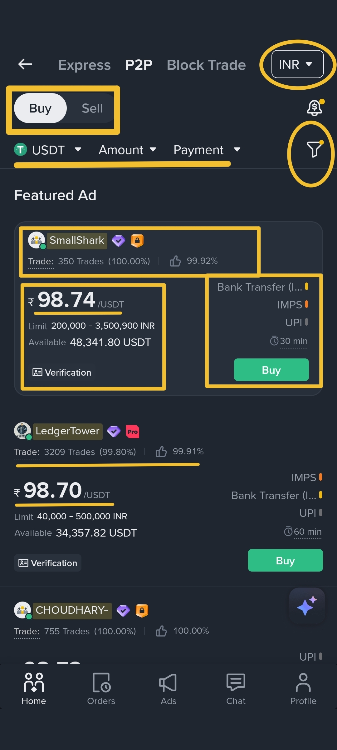 Navega a la sección P2P dentro de Binance y elige, "Comprar" la criptomoneda que deseas (por ejemplo, USDT, BTC, BNB)