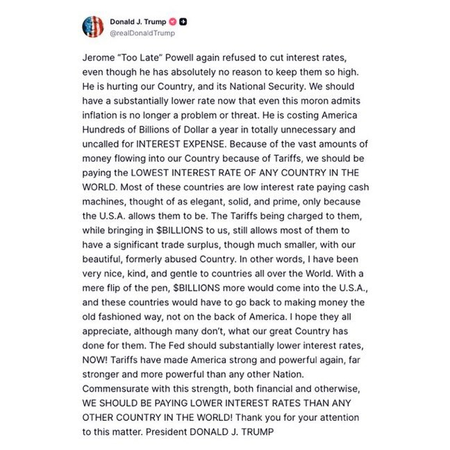 Trump está tirando de la oreja a Powell frente al mundo y le dice: "o bajas las tasas y abaratas los préstamos, o estás arruinando el país y nos haces pagar cientos de miles de millones más en deudas. Trump quiere un mercado "llameante" y tasas "bajas" para continuar con su proyecto económico.