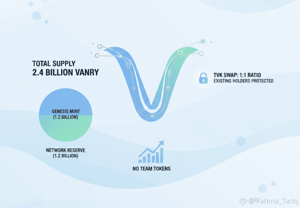 VANRY’s token distribution is structured to prioritize network security, continuity for existing holders, and long-term sustainability. The total supply is fixed at 2.4 billion VANRY tokens, with a clear distinction between tokens minted at genesis and tokens reserved for future network operation.